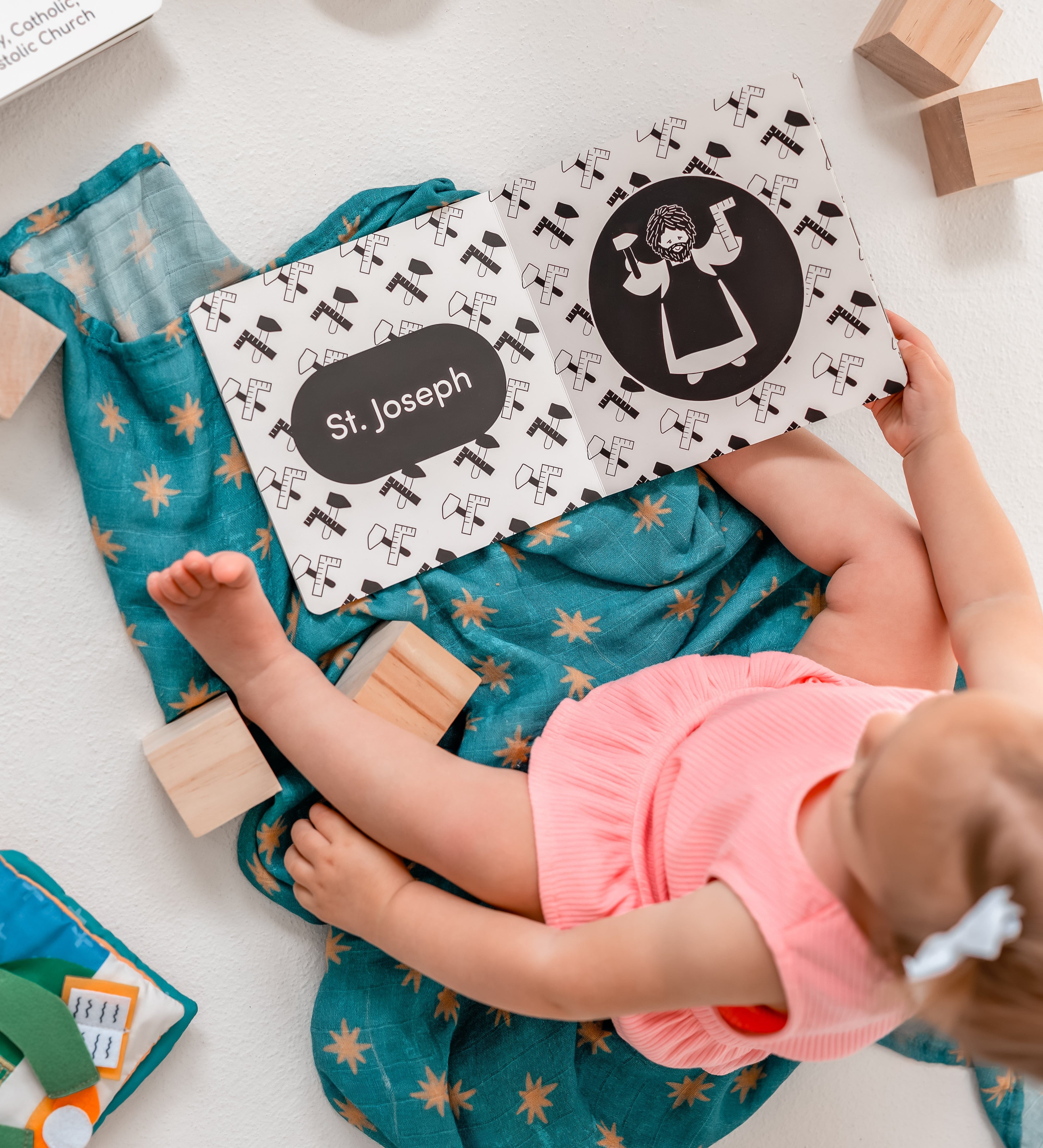 Child playing with colorful educational cloth book