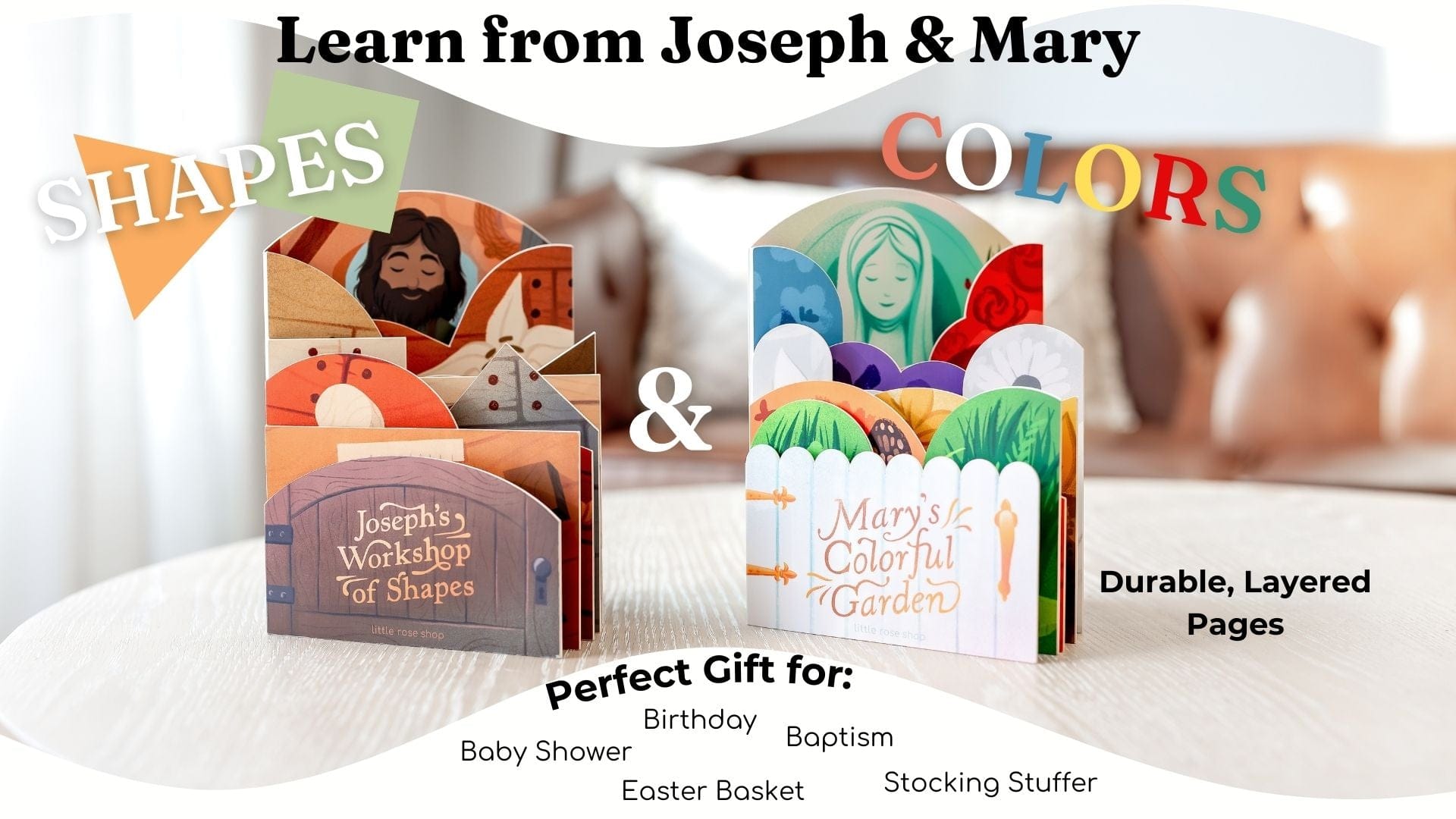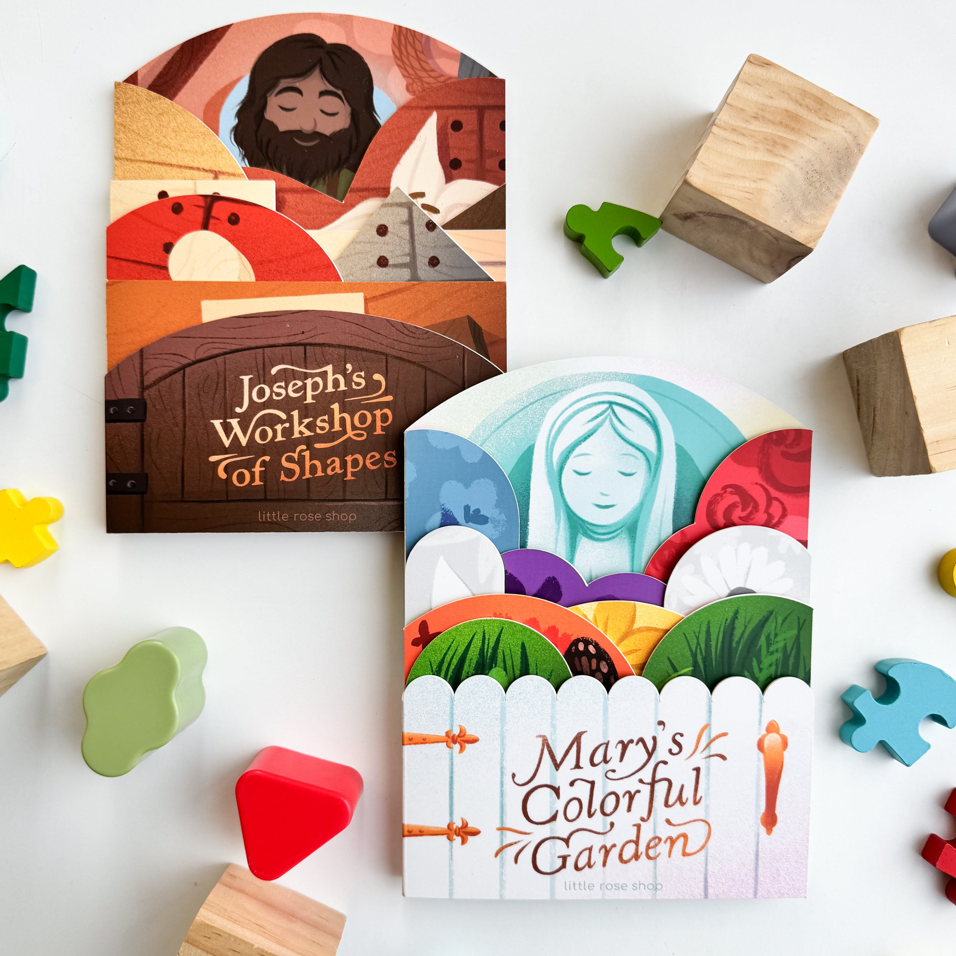 Each book reveals a faith-filled scene: children will journey through Mary’s flower garden while learning colors, and discover St. Joseph building for Jesus while exploring shapes. Designed for little hands and big hearts, this bundle is a meaningful gift for Catholic parents, grandparents, and teachers nurturing both faith and foundational learning.