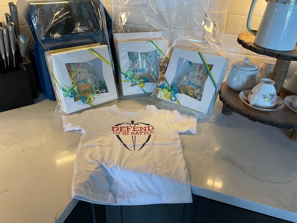 White t-shirt with Defend Us In Battle graphic.